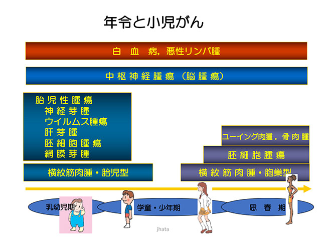 新生児期、乳児期、幼児期、学童期、思春期のように成長と発達の著しい時期に極めて多種類のがんが発生します。特に新生児期から幼児ないし学童期前半にかけては、小児がんの特徴を最もよく表している胎児性腫瘍として一括される固形がんが発生します。神経芽腫、腎芽腫、胚細胞腫瘍、肝芽腫、網膜芽腫、横紋筋肉腫などがそれに相当します。