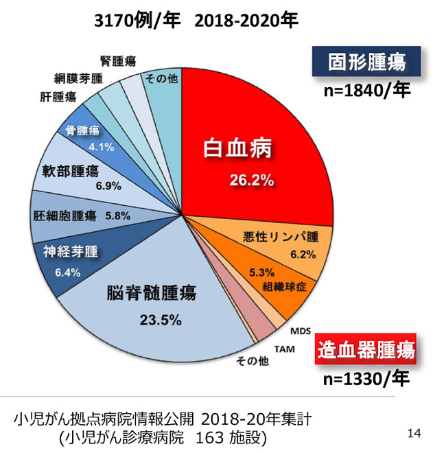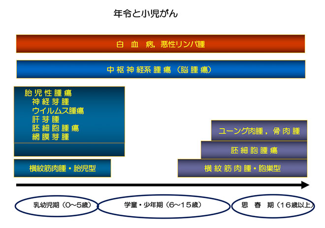 全体の約1/3が白血病などの血液腫瘍、1/3弱が中枢神経系腫瘍、1/3強がその他の固形腫瘍である。固形腫瘍では神経芽腫が最も多く、次いで胚細胞腫瘍、軟部腫瘍(横紋筋肉腫、Ewing肉腫群腫瘍などを含む),骨肉腫、腎腫瘍、肝腫瘍,網膜芽腫などである。