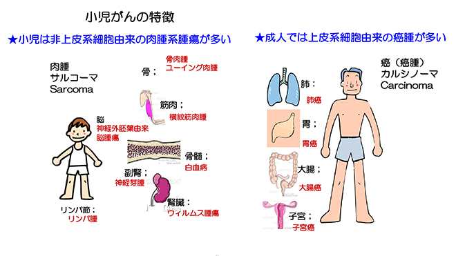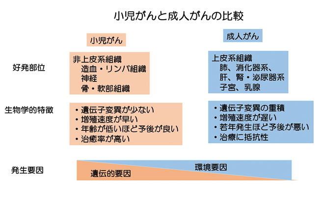小児がんは成人のがんと比較して、以下のような際立った特徴が認められる。この特徴を充分理解することが新しい治療法の開発や診断法の向上に極めて重要である。