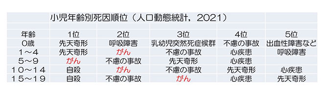 小児がんは19歳まで、0歳代を除いて病気により死因のトップを占めている(表2)。